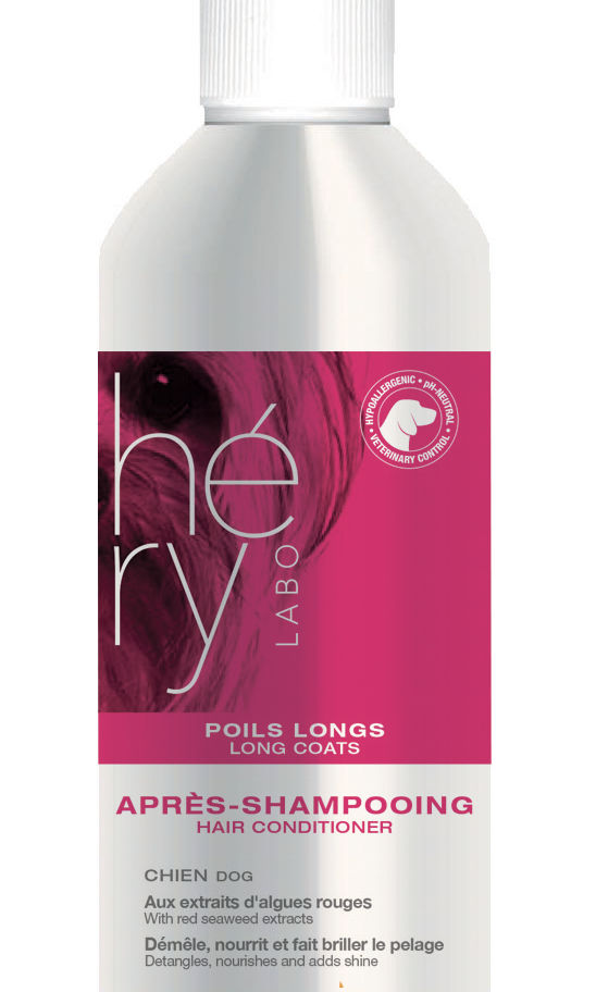 Après-shampooing pour chien Poils Longs Héry. Nourrit, démêle, apporte brillance au pelage. Aux extraits d'algues rouges.