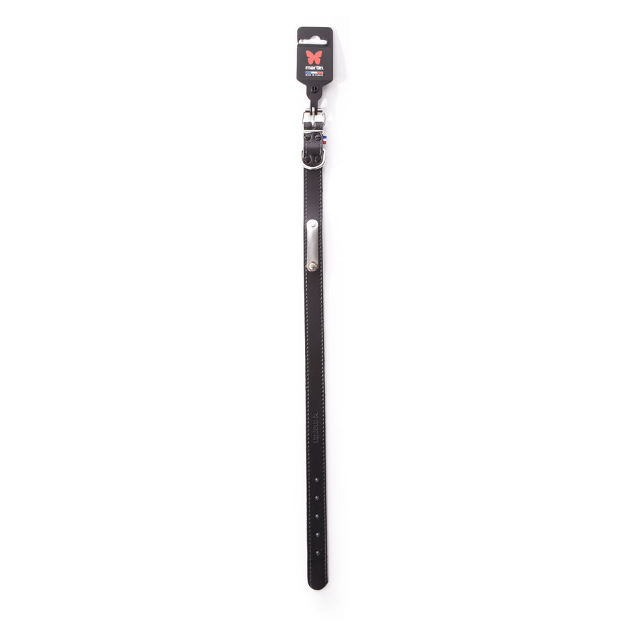 Collier en cuir rouge avec une plaque d'identification rivetée. Assemblage riveté. Effet piqué. Bouclerie en acier chromé. Collier en cuir pleine fleur. Fabriqué en France.