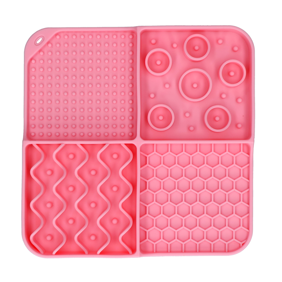 Ce tapis à lécher carré avec 4 motifs (nopes, cercles, vagues et nid d'abeille) et des compartiments profonds rend le léchage de toutes les friandises encore plus difficile ! Le chien ou le chat devra travailler dur pour lécher tout ce qui se trouve entre les picots et dans les coins. Grâce aux ventouses situées à la base, vous pouvez facilement fixer le tapis à lécher sur une surface lisse, afin qu'il ne bouge pas pendant que le chien ou le chat le lèche.