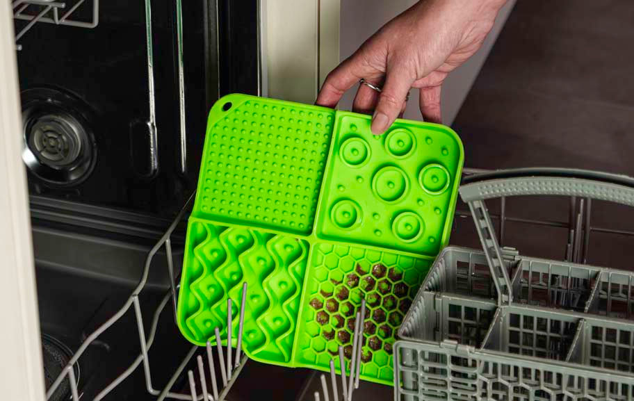 Ce tapis à lécher est fabriqué à 100 % en silicone et peut être lavé au lave-vaisselle.