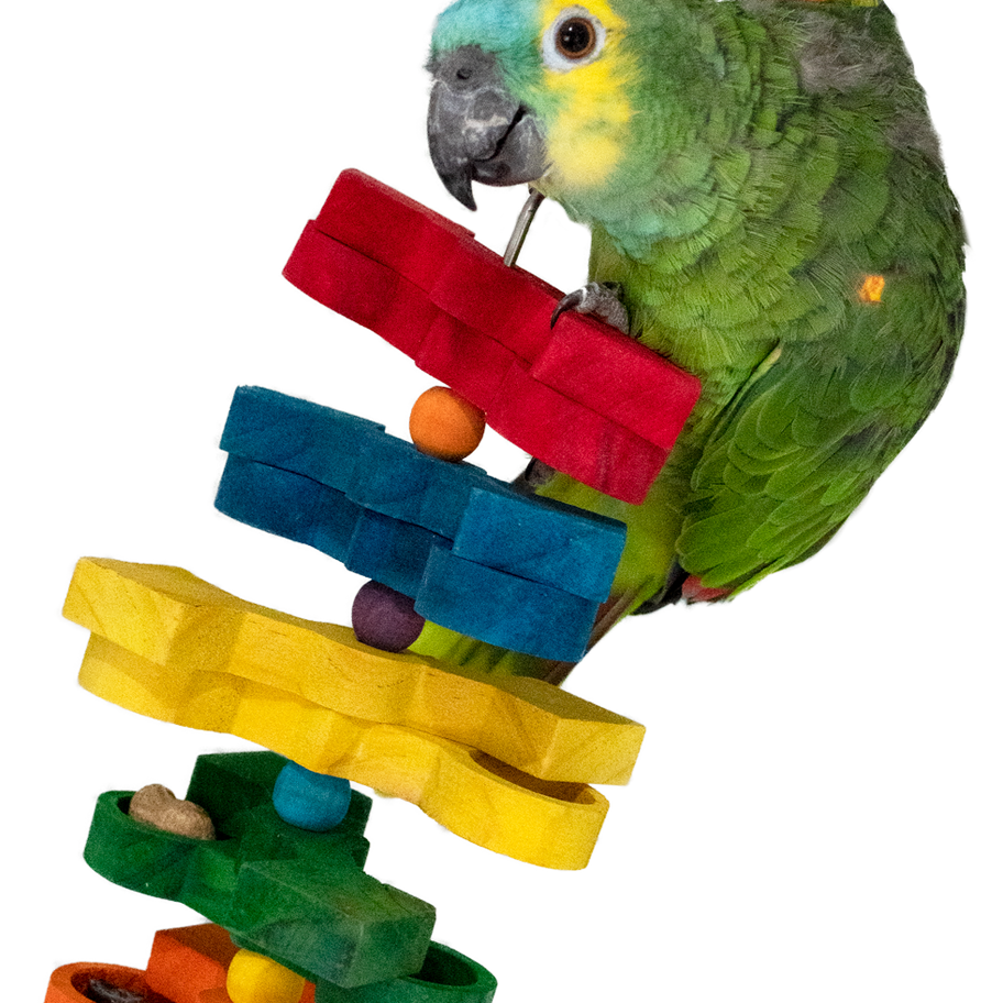 Ce puzzle en bois est facile à suspendre dans la cage et arbore des couleurs vives.